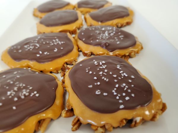 A generous heap of caramel over chopped pecans and topped with dark chocolate, also available topped with salt for a savory and sweet treat.